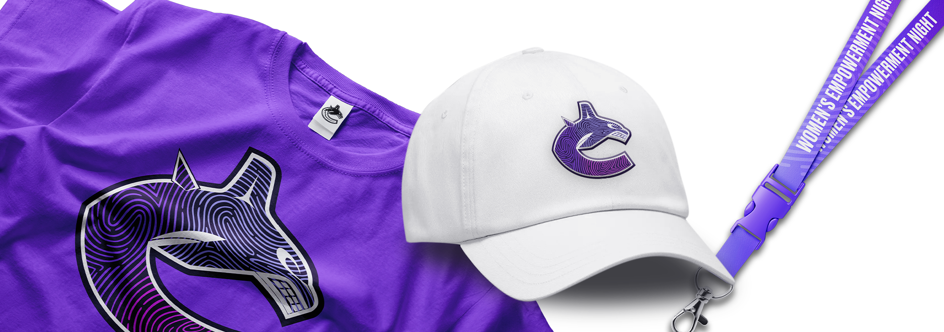 This logo and design system was presented for the fourth annual Women's Empowerment Night for the Vancouver Canucks. Working closely with the other two female designers on the team, our fingerprints are intertwined within the Canucks logo to symbolize the unseen contributions of women within the organization. We each have a part of the orca but woven together through the intricate lines of our unique fingerprint lines as well as the merging of colours throughout. This system would be used for social content, website platforms, print signage, and retail collections.